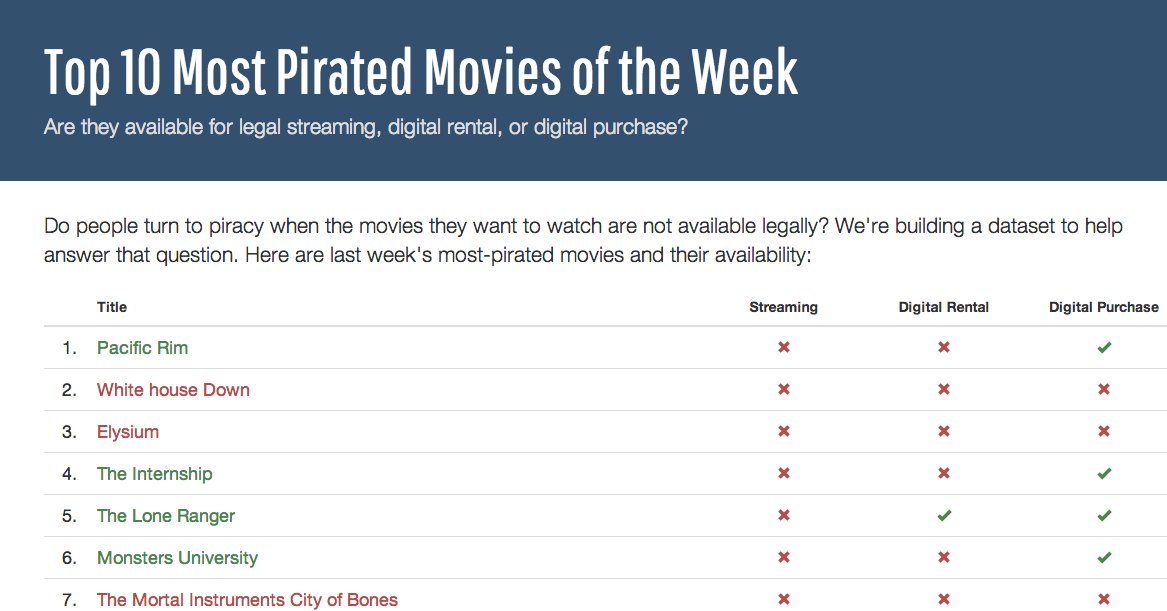 The site lists the top 10 most pirated films on BitTorrent and checks whether those films are available to stream, rent, or purchase digitally. In a simple chart, it shows how few options users have for accessing these in-demand movies. Since the site began recording three weeks ago, only 20% have been available for digital rental and none have been available for streaming. This site goes to highlight the underlying problem of unauthorized file sharing: the high demand for legal access to films is not being met when we clearly already have the technology to enable this experience.