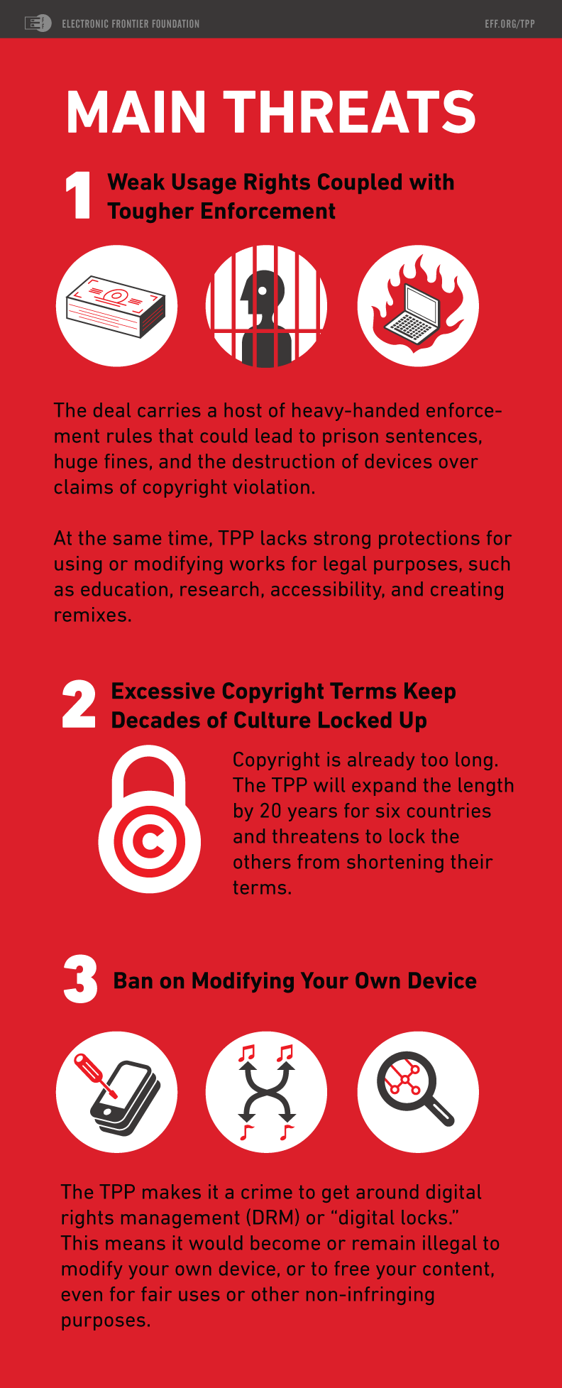 Anyone familiar with the Trans-Pacific Partnership (TPP) may find that it can be challenging to explain to others, in simple terms, how it threatens our rights online and over our digital devices. We often begin by describing the secretive, corporate-captured process of the negotiations that ultimately led to the final deal, then go into some of the specific policies—including its ban on circumventing digital locks (aka Digital Rights Management or DRM), its copyright term extensions that will lengthen restrictions on creative works by 20 years, and its inclusion of "investor-state" rules that could empower multinational corporations to undermine new user protections in the TPP countries.