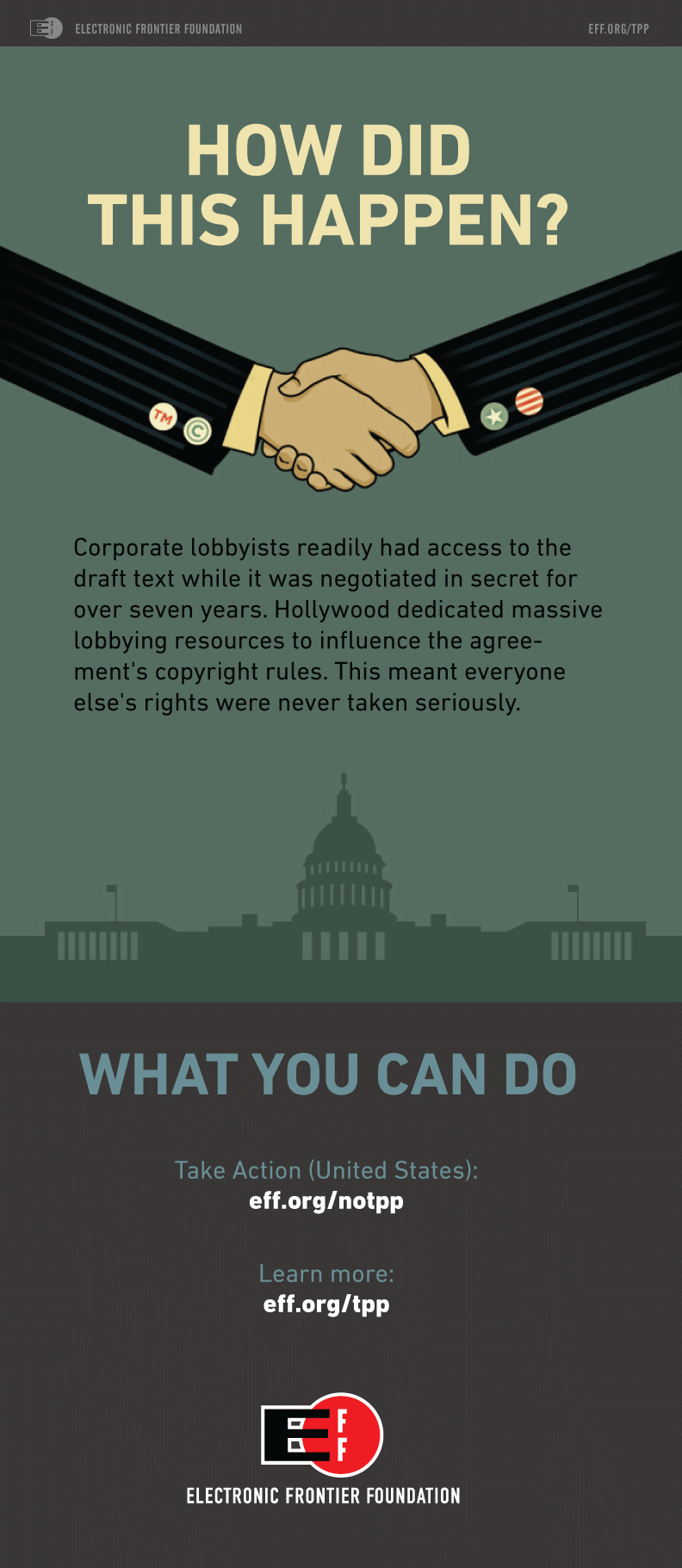 But sometimes it's easier and more effective to spread the word about a complicated issue with imagery. That's why we created this new infographic that highlights just three of the most problematic aspects of TPP. We hope this will help users, advocates, and innovators from around the world spread the word about how this agreement will impact them and their societies.