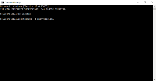 5. Type the following text exactly: “gpg -d encrypted.eml”, then hit the “Enter” key. Outlook users should type exactly “gpg -d encrypted.asc” instead.