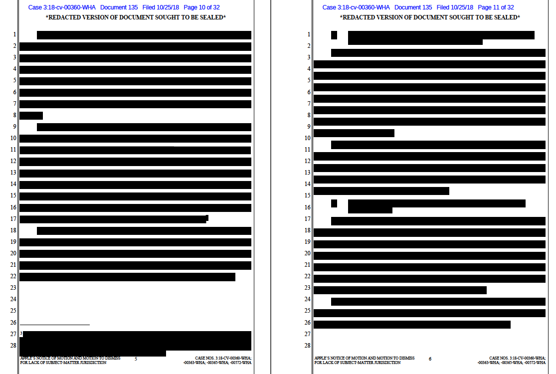 We say it “appears” that Apple is making these arguments because the briefing is redacted to an almost comical level. For example, here are some representative pages from the “background” section of Apple’s motion to dismiss: