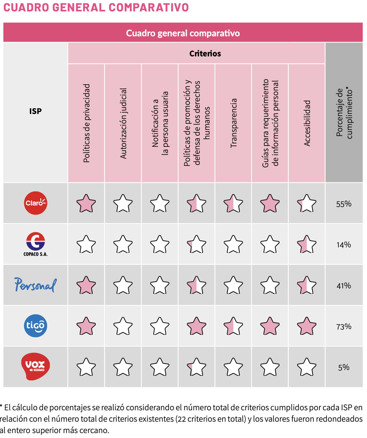 En el lado positivo, tres de los cinco proveedores del informe cumplieron todos los criterios en la categoría de política de privacidad. Ninguna empresa reveló sus políticas sobre recopilación de datos cuando comenzaron los informes de TEDIC en 2017. El progreso, aunque lento, es notable dado que Paraguay no tiene una ley integral de protección de datos, uno de los pocos países latinoamericanos sin ella. Hay un proyecto de ley pendiente en el Parlamento de Paraguay, pero no ha sido finalmente aprobado hasta ahora.