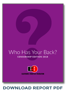Given policymakers' and the public's intense focus on cracking down on speech they consider undesirable, this year's Who Has Your Back report features substantially redesigned categories and criteria. Since the Electronic Frontier Foundation began publishing Who Has Your Back in 2011, it has generally focused on the practices of major consumer-facing Internet companies regarding government requests to produce user data. This year, we shift our focus to companies' responses to government requests to take down user content and suspend user accounts.