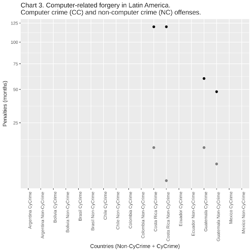 Another country where we found unreasonable differences is Guatemala, where data interference (see Chart 2) doubles the maximum penalty when the interference has been produced using computers. The same happens with computer-related forgery (see Chart 3)77. In Costa Rica, computer-related fraud is punished with a harsher penalty scale than fraud committed through other means (see Chart 4)78.